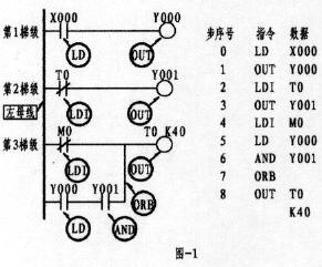 第3梯級;左邊第一個觸點為常閉,上標(biāo)為M0, M為輔助繼電器(該繼電器有多種,注意類別),其指令的正確表示應(yīng)為:4、LDI  M0(如程序所示)。本梯級的第2行第一個觸點為常開,上標(biāo)為Y000,Y表示輸出繼電器,由于該觸點與后面Y001觸點呈串聯(lián)關(guān)系,形成了所謂的電路"塊",故而其觸點的指令應(yīng)為 5、LD  Y000。總之LD與LDI指令從上面可以看出,它們均是左母線每一梯級第一觸點所使用的指令。而梯級中的支路(即第3梯級的第2行)有二個或二個以上觸點呈串聯(lián)關(guān)系,其第一觸點同樣按LD或LDI指令。可使用LD、LDI指令的元件有:輸入繼電器X、輸出繼電器Y、輔助繼電器M、定時器T、計數(shù)器C、狀態(tài)繼電器S。OUT為線圈驅(qū)動指令,該指令不能出現(xiàn)在左母線第一位。驅(qū)動線圈與驅(qū)動線圈不能串聯(lián),但可并聯(lián)。同一驅(qū)動線圈只能出現(xiàn)一次,并安排在每一梯級的最后一位。如上圖中的1、OUT  Y000,3、OUT  Y001,Y為輸出繼電器,其線圈一旦接獲輸出信號,可以這樣認(rèn)為,線圈將驅(qū)動其相應(yīng)的觸點而接通外部負(fù)載(外部負(fù)載多為接觸器、中間繼電器等)。而上圖8、OUT  T0  K40 為定時器驅(qū)動線圈指令,其中的K為常數(shù)40為設(shè)定值(類似電工對時間繼電器的整定)。可使用OUT指令元件有:輸出繼電器Y、輔助繼電器M、定時器T、計數(shù)器C、狀態(tài)繼電器S。