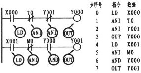 由第1梯級來看;X000、T0、Y001三觸點成串聯(lián)關(guān)系,即T0的常閉串接于X000的后端,而Y001的常閉則串接于T0常閉的后端。由于都是常閉故用ANI指令。現(xiàn)來看第2梯級;X000、M0、Y001,同樣三觸點也是串聯(lián)關(guān)系,M0的常閉接點串接于X001的后端,而Y000的常開接點則串接于M0的后端。故M0的指令用ANI,而Y000的指令則用AND(具體編程詳上圖),一句話只要是串聯(lián)后面是常開的用AND,是常閉的則用ANI。可使用AND、ANI指令元件有:輸入繼電器X、輸出繼電器Y、輔助繼電器M、定時器T、計數(shù)器C、狀態(tài)繼電器S。
