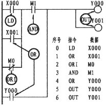 可以看出上圖的X000、X001、M0三者處于并聯(lián)關(guān)系。由于X000下面二條支路均為單個觸點,因X001是常開觸點,故用OR指令。而M0是常閉觸點,則用ORI指令。三接點并聯(lián)后又與M1串聯(lián),串聯(lián)后又與Y000并聯(lián),而Y000也是單個觸點,所以仍采用OR指令。可使用OR、ORI指令元件有:輸入繼電器X、輸出繼電器Y、輔助繼電器M、定時器T、計數(shù)器C、狀態(tài)繼電器S。