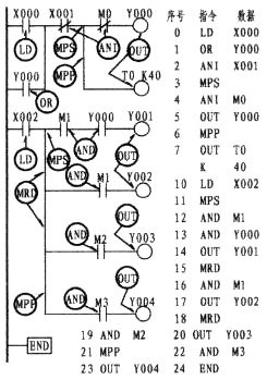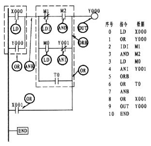 由上圖可以看出,第一支路X003的常開觸點與M1的常開觸點成串聯(lián)關(guān)系(在這樣的情況下,形成了塊的關(guān)系),它是與上一行的X000與M0串聯(lián)后相并聯(lián),此時程序的編寫,如步序號0、1、2、3、4所示。4所出現(xiàn)的第一個ORB指的是與上一行并。而第二支路,常閉Y001與M2同樣是串聯(lián)關(guān)系。也是一個塊結(jié)構(gòu),其串聯(lián)后再與第一支路并。故步序7再次出現(xiàn)ORB。ORB指令并無梯形圖與數(shù)據(jù)的顯示。可以這樣認(rèn)為;它是下一行形成電路塊的情況下與上一行并聯(lián)的一條垂直直線(如圖中所示的二條粗線)。