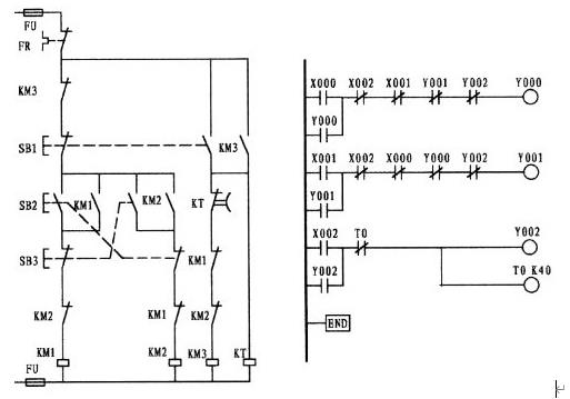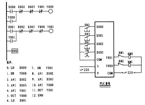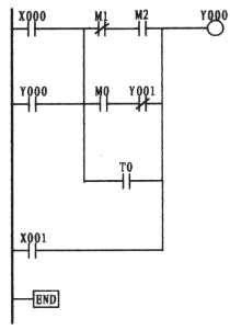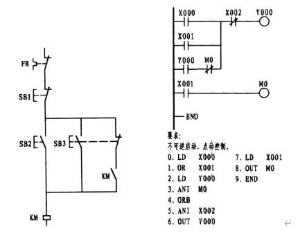這一道題往往是初學(xué)者邁不過的一道坎。這主要是因為繼電器電原理圖使用的是復(fù)合按鈕,形成的思維定式所造成。從梯形圖中可以看出,X001為點動控制觸點,因左邊的電原理圖是使用的復(fù)合按鈕,思維上自然而然轉(zhuǎn)向了采用X001的常閉觸點,與X001的常開形成了與復(fù)合按鈕相似的效果,想象是不錯。要知道PLC在運(yùn)行狀態(tài)下,是以掃描的方式按順序逐句掃描處理的,掃描一條執(zhí)行一條,掃描的速度是極快的。如果是用X001的常閉代替M0的常閉的話,當(dāng)按下外接點動按鈕時,X001常開觸點則閉合而常閉接點則斷開,但一旦松手其常閉觸點幾乎就閉合形成了自保,因此失去了點動的功能,變?yōu)橹挥袉拥墓δ堋L菪螆D中的第一梯級中的第二支路是由Y000的常開與中間繼電器M0的常閉相串后再與第一支路相并,在這樣觸點多的情況下如果允許應(yīng)將它擺列在第一行,這樣在編程時可以少用了ORB指令。
