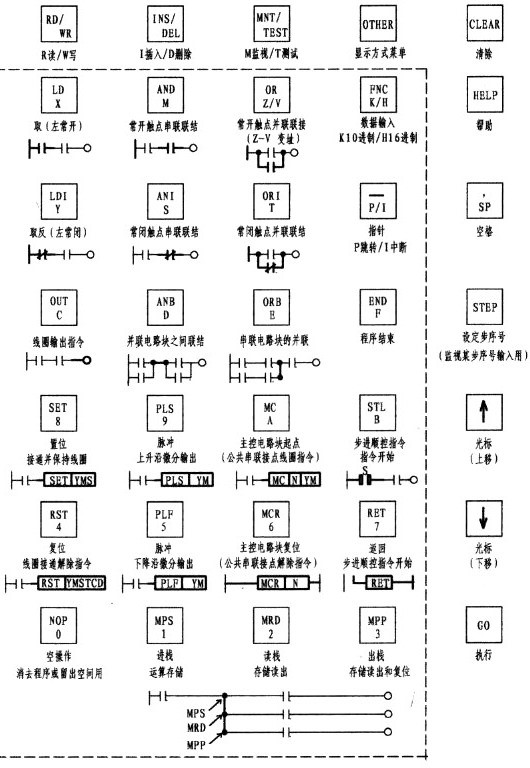 ⑨指令鍵/元件符號鍵/數(shù)字鍵(虛線框內(nèi)):這些鍵均可自動切換,上部為指令鍵,下部為元件符號鍵或數(shù)字鍵。一旦按了指令鍵,其它鍵即切換成元件符號或數(shù)字,可以進(jìn)行選擇輸入。其它Z/V、K/H、P/I均可同一鍵的情況下相互切換。