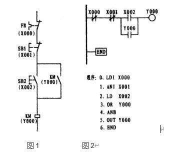 上圖的圖1為電原理圖,圖2則為按與原理圖一一對應(yīng)的原則編繪的梯形圖,其特點是易于理解,但在我的印象中沒有幾張是可以這樣繪制的。如果采用這樣的方法繪制的話,將有可能走入不歸路。盡管二個圖都可運(yùn)行,但如果將圖2加以改變而成為圖3 ,可以看出圖3在程序上少了一個步序ANB。簡潔明了是編程的要素。故而在編繪梯形圖時應(yīng)盡量地將多觸頭并聯(lián)觸頭放置在梯形圖的母線一側(cè)可減少ANB指令。圖2中的X000、圖3中的X002均為外接熱繼電器所控制的常閉接點,而熱繼電器則用常開接點(或也可將外部的熱繼電器的常閉觸頭與接觸器線圈相串聯(lián))。只有在畫出梯形圖后,再根據(jù)梯形圖編出程序。