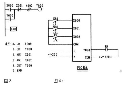 工作原理:以圖3為例說明,當(dāng)外接啟動按鈕一按,X000的常開接點立即閉合電流(實為能流),流經(jīng)X001、X002的常閉接點至使輸出繼電器Y000閉合,由于Y000的閉合,并接于母線側(cè)的Y000常開觸點閉合形成自保,由輸出繼電器接通外部接觸器,從而控制了電動機(jī)的運(yùn)行。停止時按外部停止按鈕,X001常閉接點在瞬間斷流從而關(guān)斷了輸出繼電器線圈,外部接觸器停止運(yùn)轉(zhuǎn)。當(dāng)電動機(jī)過載時,外部熱繼電器常閉接點閉合,導(dǎo)至X002常閉接點斷開,從而保護(hù)電動機(jī)。