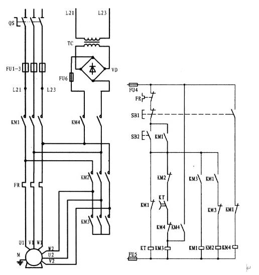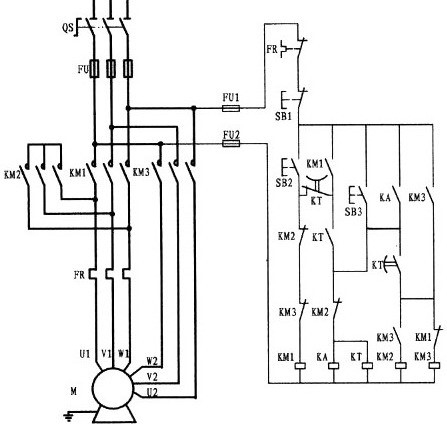 該線路控制的是一臺雙速電動機(jī),一般的人對它不是很理解。電動機(jī)型號為YD123M-4/2,6.5/8KW,△/Y。根據(jù)型號解讀;該電機(jī)具有二種速度即4極和2極,在4極速度下,電動機(jī)的功率為6.5KW,繞組為三角形接法。如果在2極的速度下,電動機(jī)的功率為8KW,繞組為雙星接法。該電動機(jī)共有6接線頭,三角形接時(低速)電源由U1、V1、W1接入,其余接頭U2、V2、W2為懸空。星接時(高速)將接線頭U1、V1、W1接成星點形成了雙星點,三相電源則由U2、V2、W2輸入(電動機(jī)接線圖詳上圖所示)。該線路要求;電機(jī)可以在低速、高速狀態(tài)下?lián)衿湟贿\(yùn)行。而在高速運(yùn)行時則按低速啟動再轉(zhuǎn)為高速運(yùn)行。自己可根據(jù)電原理圖進(jìn)行分析。