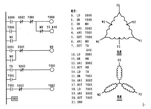 低速運(yùn)行時,按外接啟動按鈕SB1,此時第二梯級接于母線一側(cè)的X001閉合,電流(能流)則通過串接于其后的X002接通中間繼電器M0線圈,使并接于母線一側(cè)的M0常開接點閉合,使M0中間繼電器線圈形成了自保。由于M0線圈的閉合,使第一梯級第二支路母線一側(cè)的M0常閉接點閉合,同時切斷了定時器線圈T0的運(yùn)行,使電流接通了Y000輸出繼電器,外接的接觸器KM1接通使電動機(jī)處于三角形低速運(yùn)行狀態(tài)。停止,則按外接按鈕SB1即可。這就是低速運(yùn)行過程。注意:本梯形圖未設(shè)置熱保護(hù),從原圖來看熱保就少用了一個。可在梯形圖第一梯級Y001常閉接點后串接X003,同時在第四梯級X002常閉接點后串接X004。