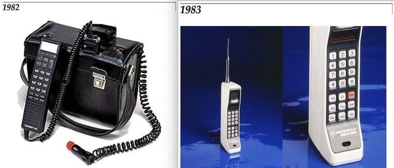 這臺(tái)機(jī)器是全球的第一臺(tái)真正的手機(jī),這也是全球第一次“真正的手機(jī)通話”——當(dāng)時(shí)歐美國(guó)家雖然有移動(dòng)電話,但全像臺(tái)式電腦一樣笨重(下圖左)。10 年后,這臺(tái)名叫 DynaTAC 的手機(jī)(下圖右)正式上市,這也是第一代的移動(dòng)通訊系統(tǒng)——1G 制式的正式登場(chǎng)。