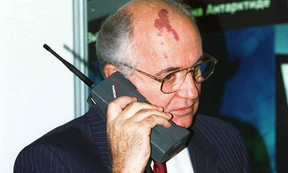 蘇聯(lián)領(lǐng)導(dǎo)人戈?duì)柊蛦谭蚴褂弥Z基亞 Cityman 900 通話。圖片來(lái)源:The Guardian