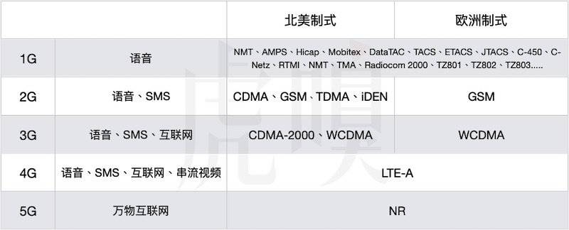 不同年代的移動(dòng)通信制式,注意 CDMA 和 TDMA 為俗稱,該制式的正式名稱為 cdmaOne 及 D-AMPS