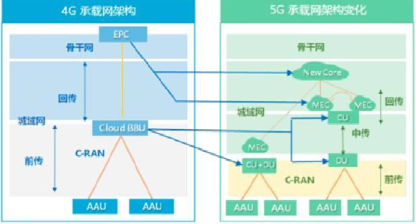 以基站端的傳輸網為例,5G網絡架構相對4G網絡架構增加了很多光纖線路,原有4G網絡中基站側的AAU光纖拉到BBU,BBU光纖直連核心網則完成組網,而5G網絡中將BBU的功能分解成了實時性要求高的DU單元和實時性要求不高的CU單元。因此除了基站建設帶來的5G AAU及5G帶寬增長導致的光纖鏈路的自然增加,還另外新增了AAU和DU、CU之間前傳和中傳的物理鏈路,這些均由光模塊和光纖及施工管路組成,從而構成新的經濟增長點和價值放大空間。