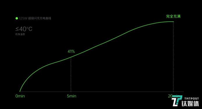 其中,vivo、小米、realme百瓦以上快充技術(shù)均表示在20分鐘內(nèi)充滿一部手機(jī)。而OPPO的125W超級(jí)閃充,5分鐘可將等效4000mAh電池的手機(jī)充至41%,20分鐘充滿。同時(shí),更將溫度嚴(yán)控在40度。而與各家不同的是,OPPO還同時(shí)推出了65W AirVOOC,在充電效率上已與此前最快有線充電速度不相伯仲, 30 分鐘充滿。