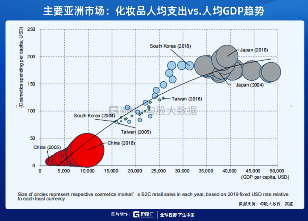 參考其他亞洲國家的情況可發(fā)現(xiàn),化妝品消費(fèi)水平和GDP之間存在較強(qiáng)的正相關(guān)關(guān)系。2019年中國化妝品支出/實(shí)際GDP為0.3%,而日韓的占比則為0.5~0.6%。